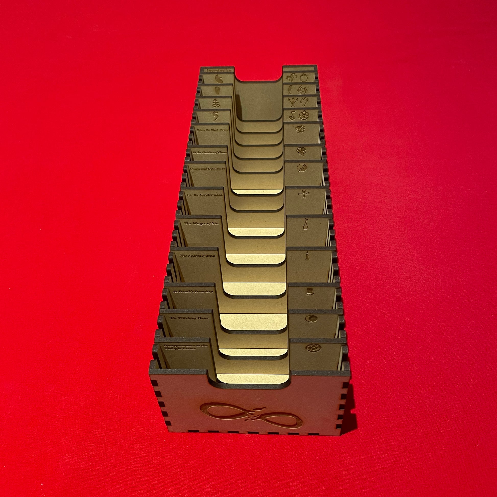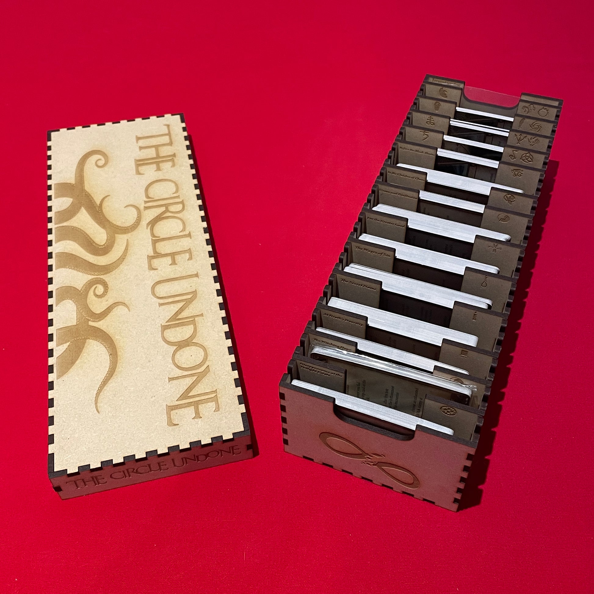 Made from quality wooden components this box is designed to hold all the scenario cards included in the the circle undone cycle. Each divider is labelled for ease of locating each specific set of cards.