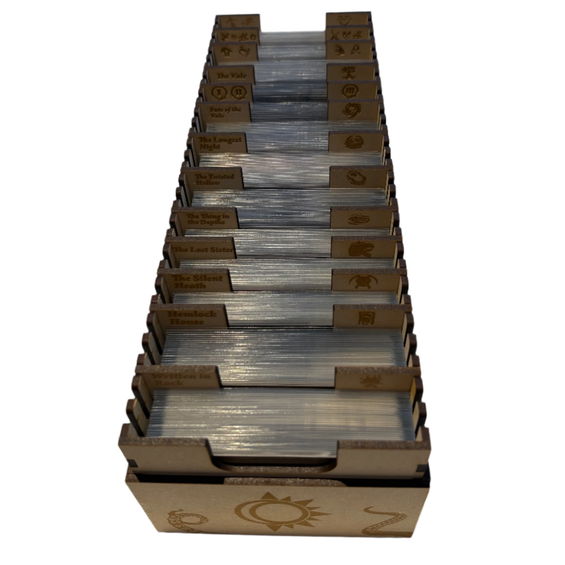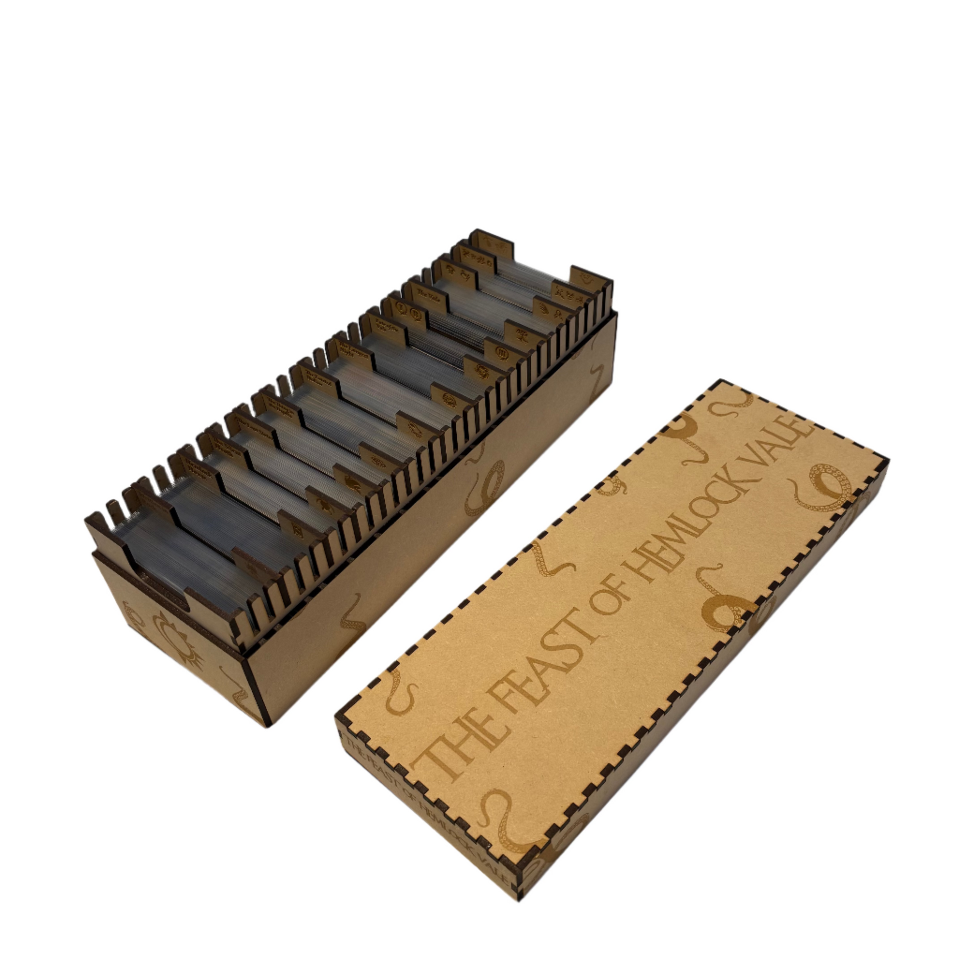 Made from quality wooden components this box is designed to hold all the scenario cards included in the feast of Hemlock Vale cycle. Each divider is labelled for ease of locating each specific set of cards.