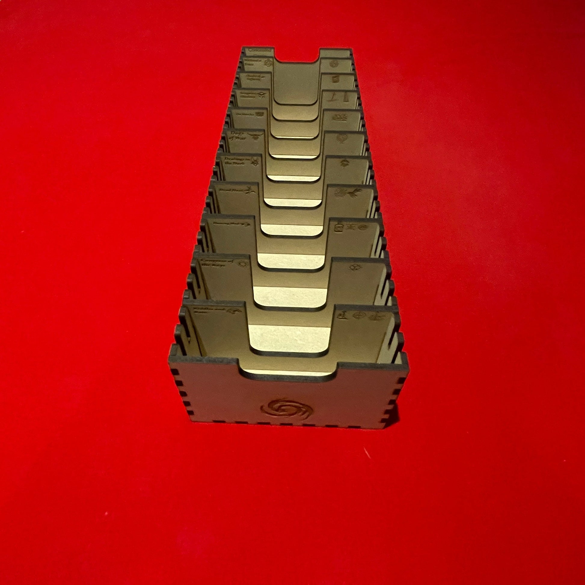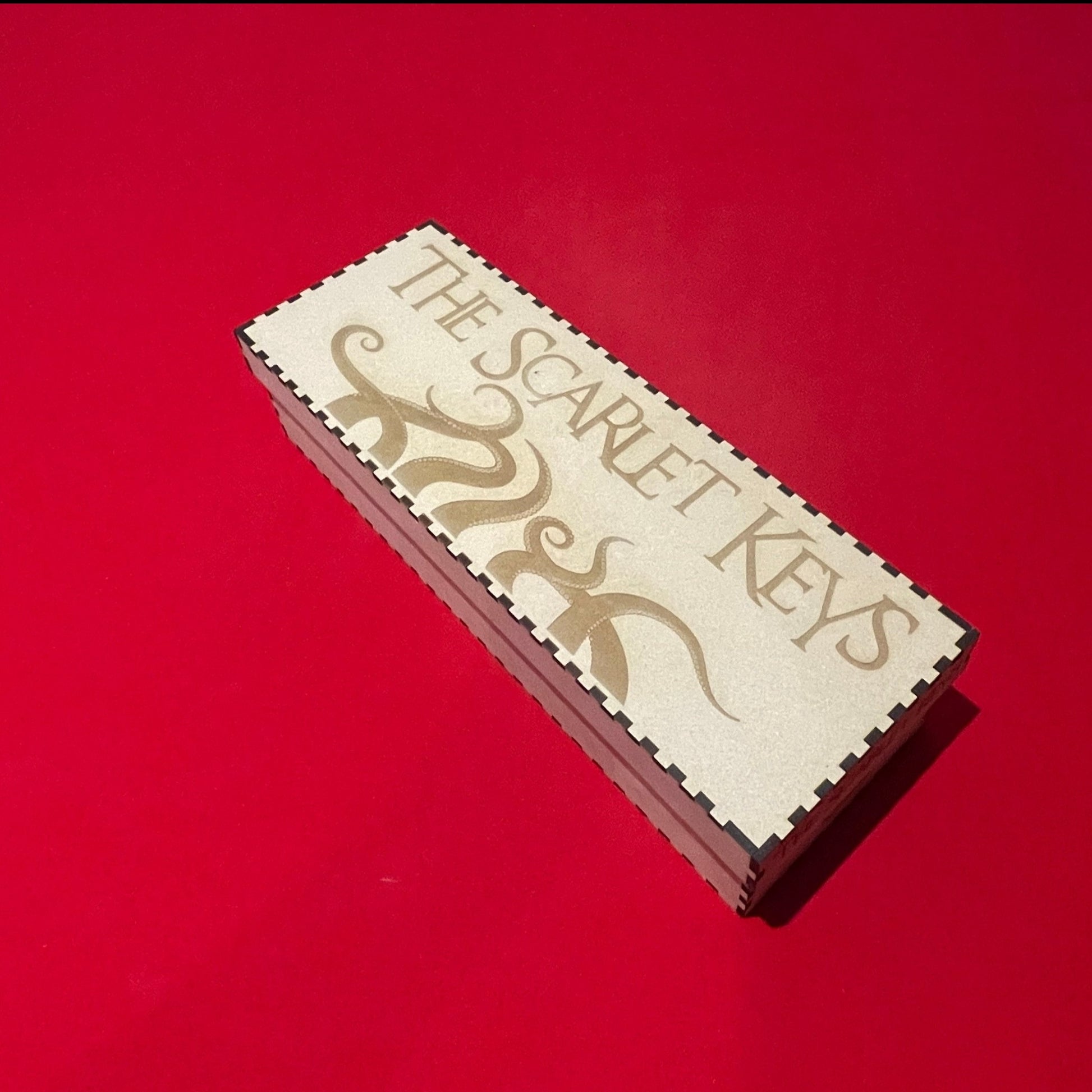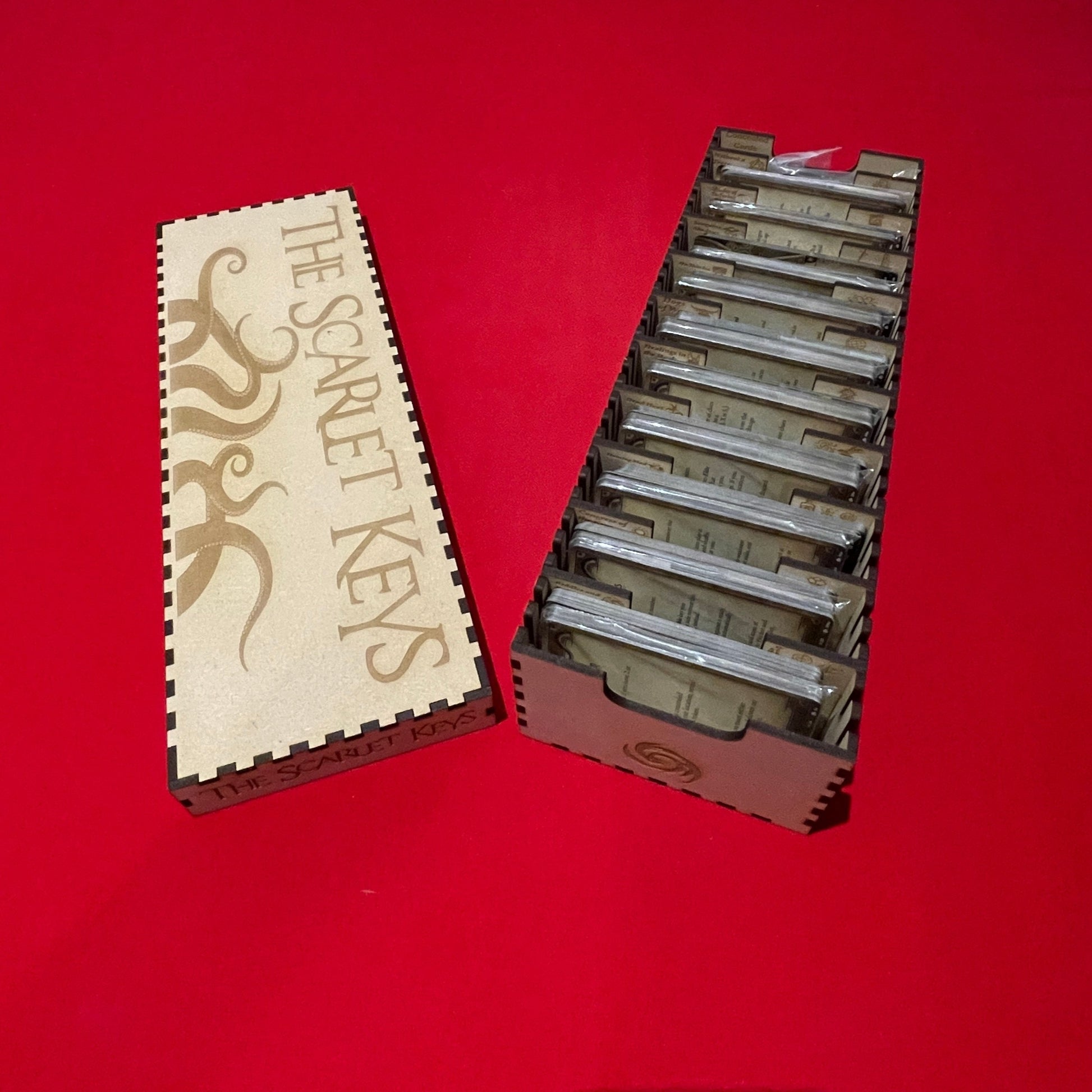 Made from quality wooden components this box is designed to hold all the scenario cards included in the the scarlet keys. Each divider is labelled for ease of locating each specific set of cards.