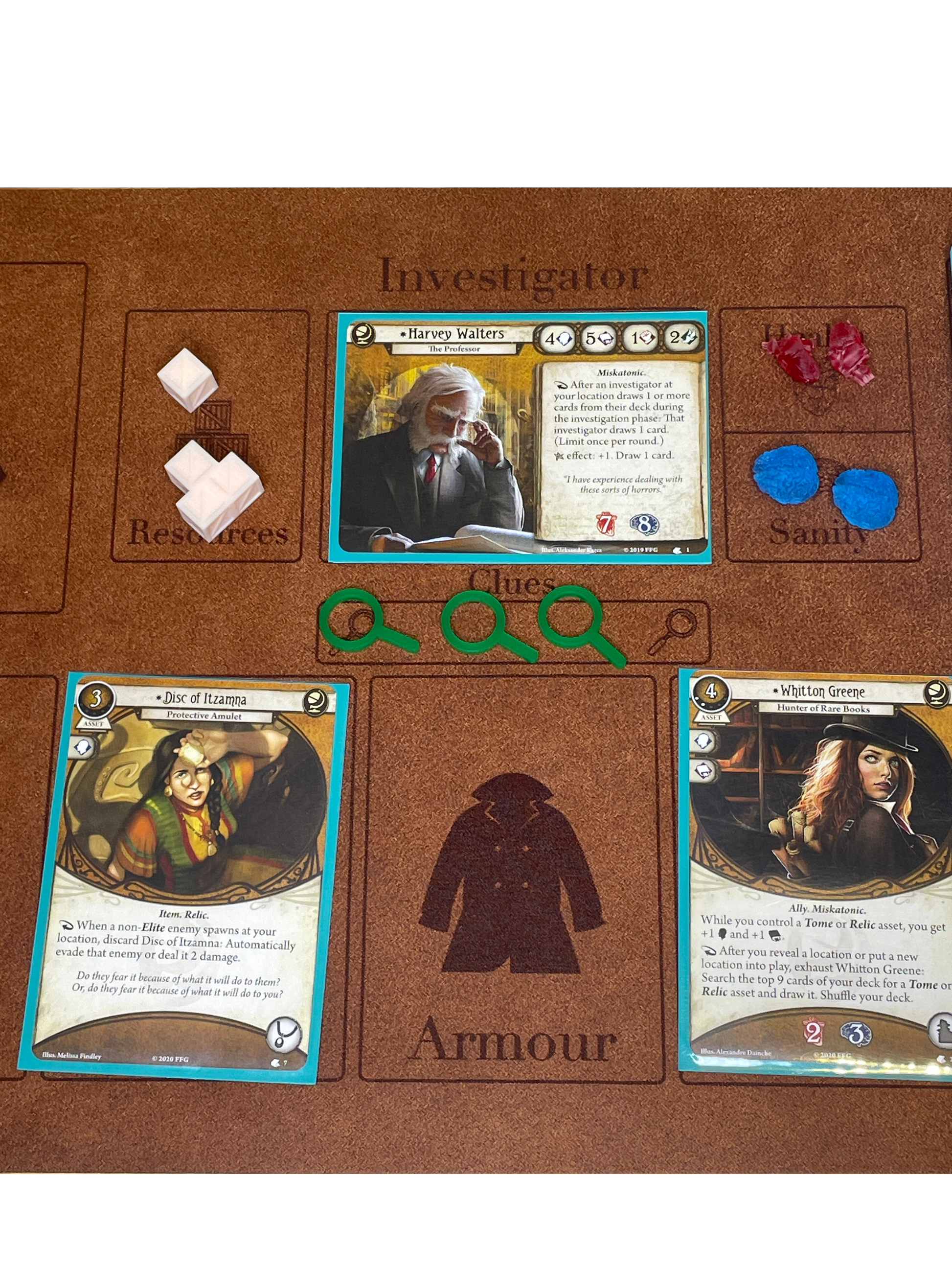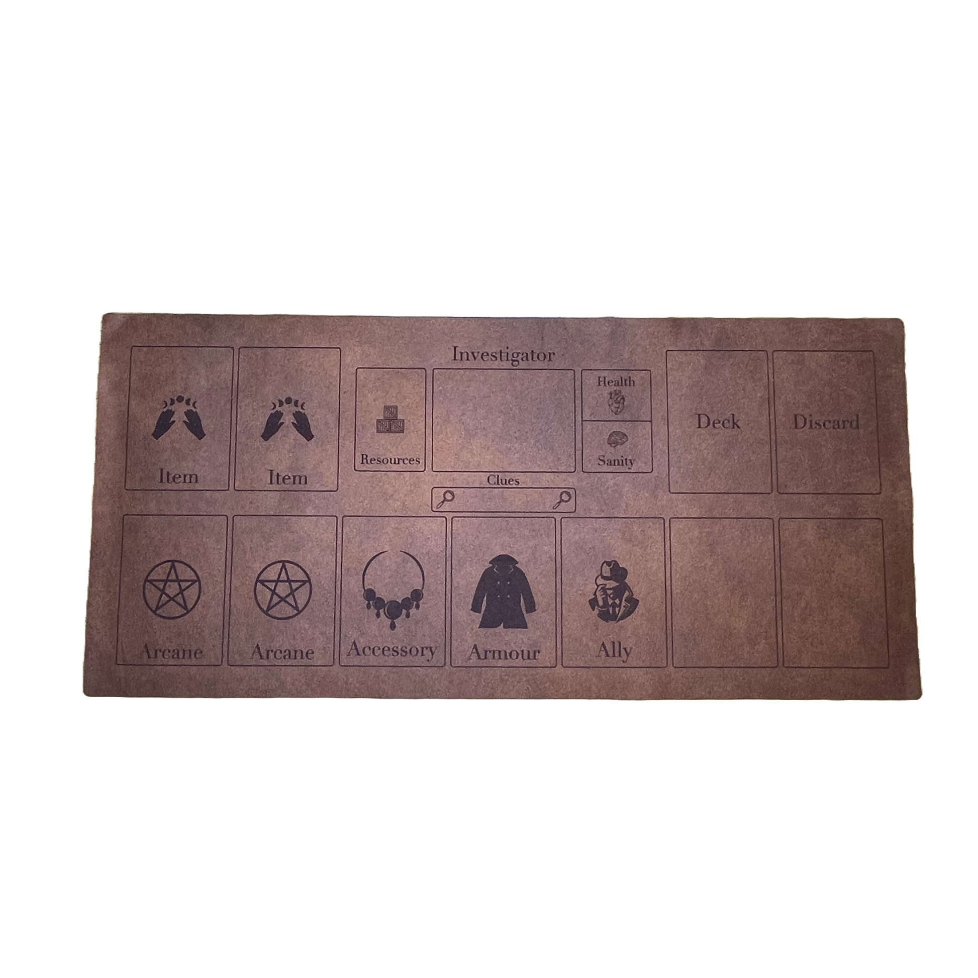Introducing the ultimate way to organise your threat area during your next Arkham Horror scenario. Our suede-like Investigator Mats are built to last, with etched images and text that will never fade or rub off. Keep your cards protected and enhance your gameplay experience.