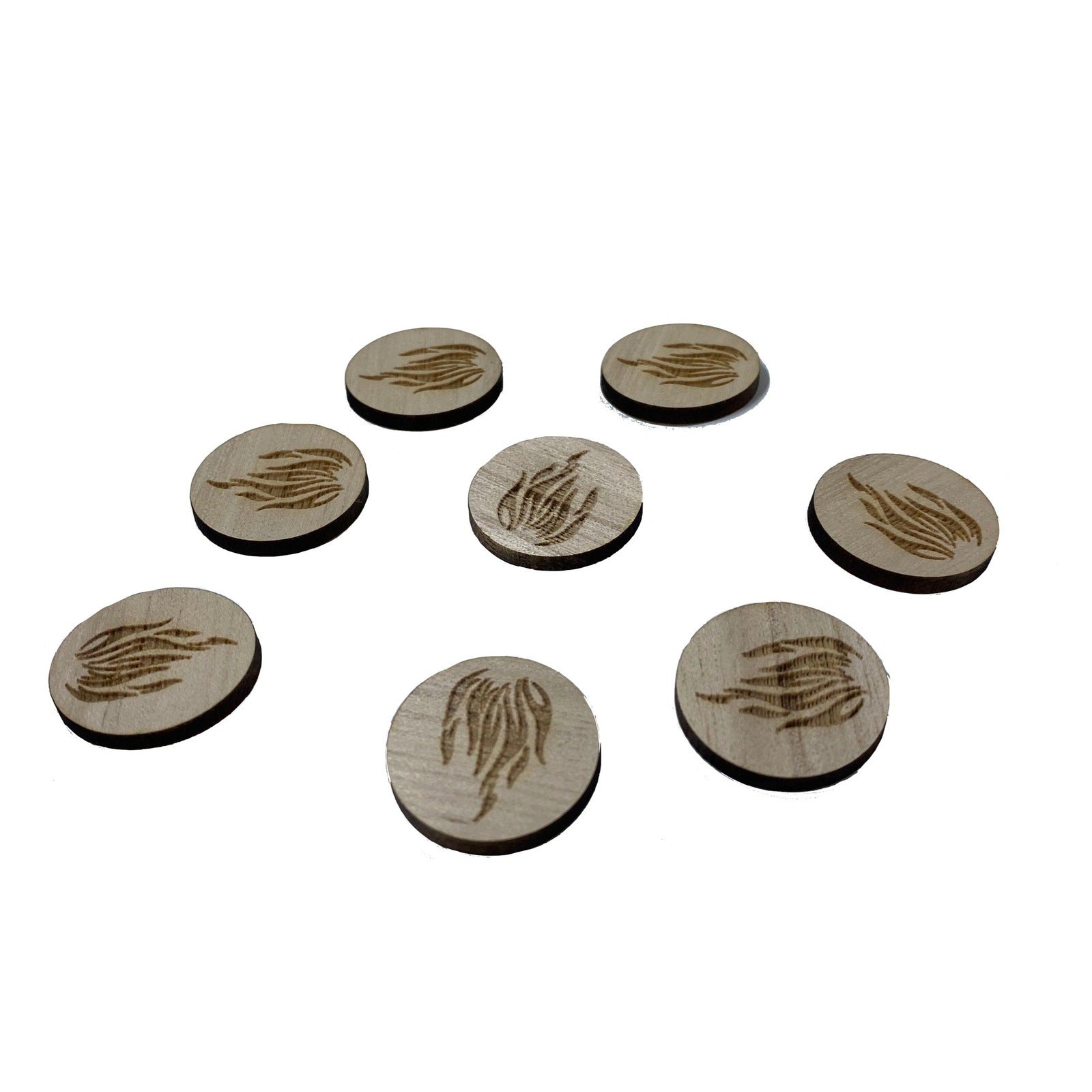 Each set comes with 8 fire tokens which are double sided on 3mm paulownia wood.