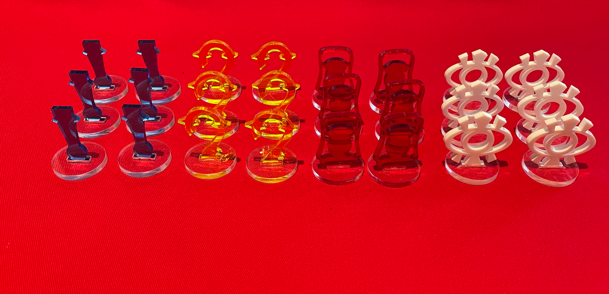 Each set comes with 24 standee tokens with clear acrylic bases and coloured symbols the same as those in the base game. Each token group comes with 6 of each standee. Each standee comes fully assembled and is not removable from the base.